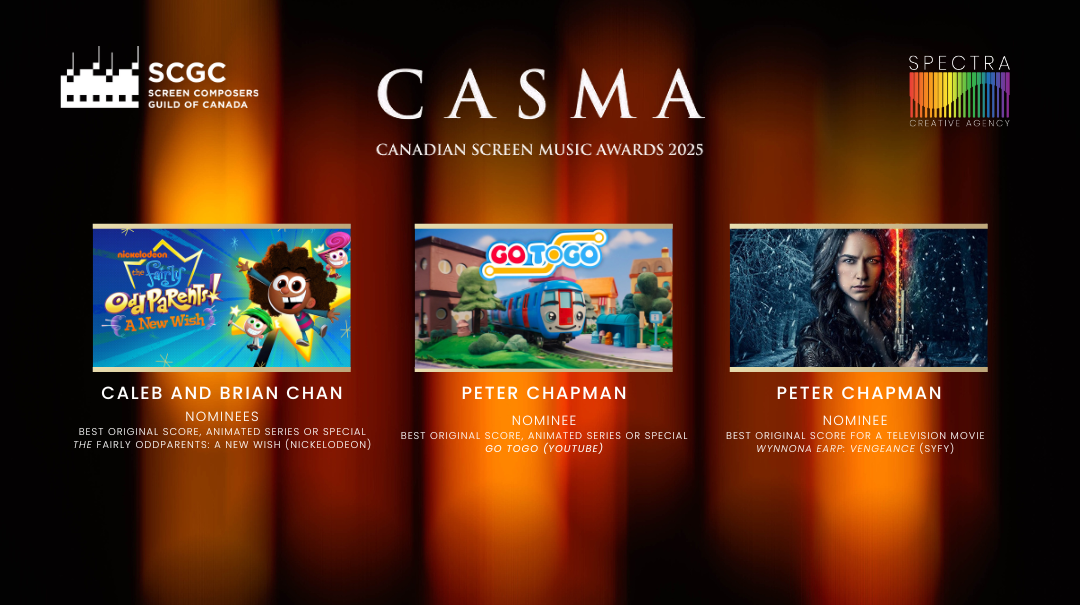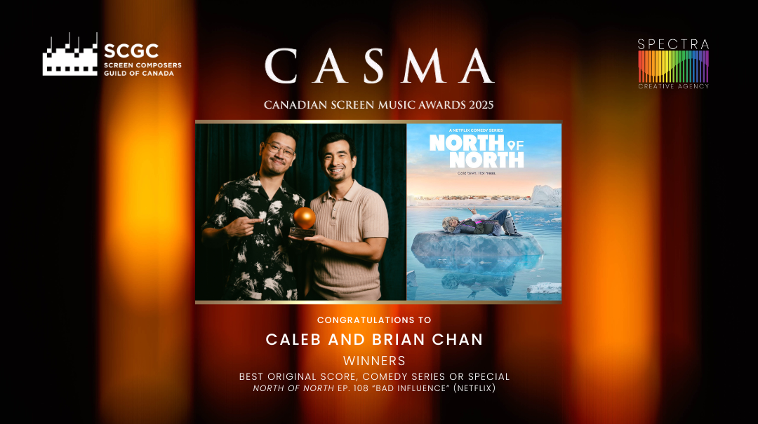 The 2025 Canadian Screen Music Awards took place on Wednesday, September 10, 2025 in Toronto, and we’re thrilled to congratulate Caleb Chan and Brian Chan for winning the CASMA for Best Original Score, Comedy Series or Special for episode 8 “Bad Influence” of the hit Netflix series North of North. This is well-deserved recognition from their peers in the Canadian composer community for a lighthearted score that features Innuk throat singing blended with contemporary production for the Netflix series that was certified fresh on Rotten Tomatoes.